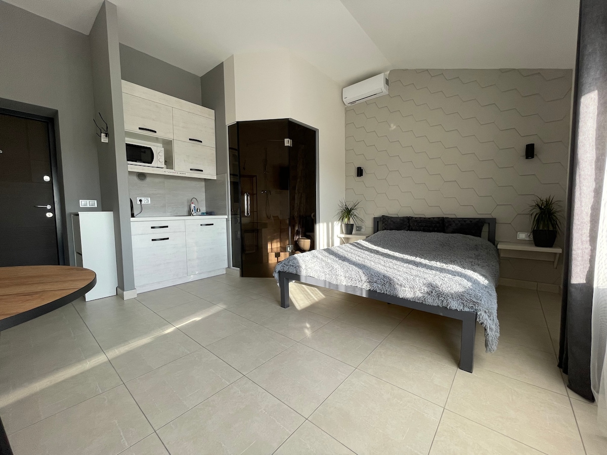 Ստուդիո բնակարան ՝ 35մ2, որը գտնվում է քաղաքի կենտրոնական մասում գտնվող բնակելի տարածքում ։ Քաղաքի կենտրոնը ոտքով 10 -15 րոպե է, կենտրոնական մեքենան և երկաթուղային կայարանը գտնվում են 15 րոպե հեռավորության վրա ։ Պատուհանից բացվում է հիանալի տեսարան, նորաոճ լուսավոր բնակարան ՝ լոջիայով, որի վրա կա ճոճանակ(մինչև 80 կգ բեռ )։ Բնակարանն ունի ամեն ինչ հարմարավետ հանգստի համար ։ Ժամանման և մեկնման հնարավոր ճկուն պայմաններ ՝ ըստ համաձայնության ։ Խնդրում ենք ստուգել բոլոր մանրամասները նախքան ժամանումը: