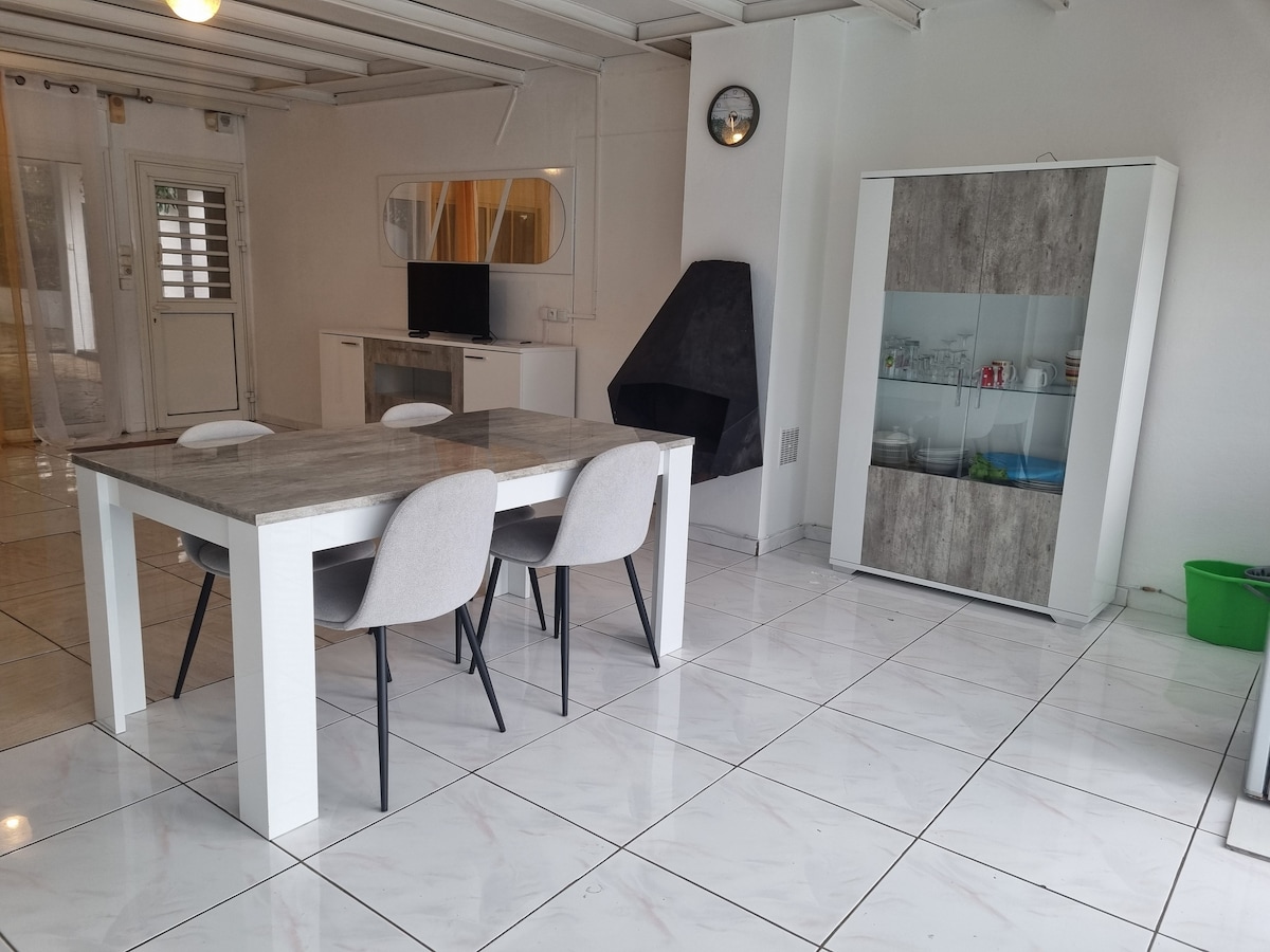 2 սենյականոց կացարան Bois de Nèfles St Paul - ում, հանգիստ տարածք ՝ խանութներով և տեղական ծառայություններով, Չորից 15 րոպե հեռավորության վրա, ճանապարհներին մոտ (արևմտյան լողափերից 25 րոպե հեռավորության վրա )։ Լիովին կահավորված և կահավորված կացարան 2 հոգու կամ 2 հոգու համար, որոնք ունեն 2 երեխա ՝ 1 ննջասենյակով և 1 լոգասենյակով, 1 հիմնական սենյակ ՝ լիովին կահավորված խոհանոցով, որտեղից բացվում է տեսարան դեպի 1 վերանդա, այգի և առանձին կայանատեղի ։