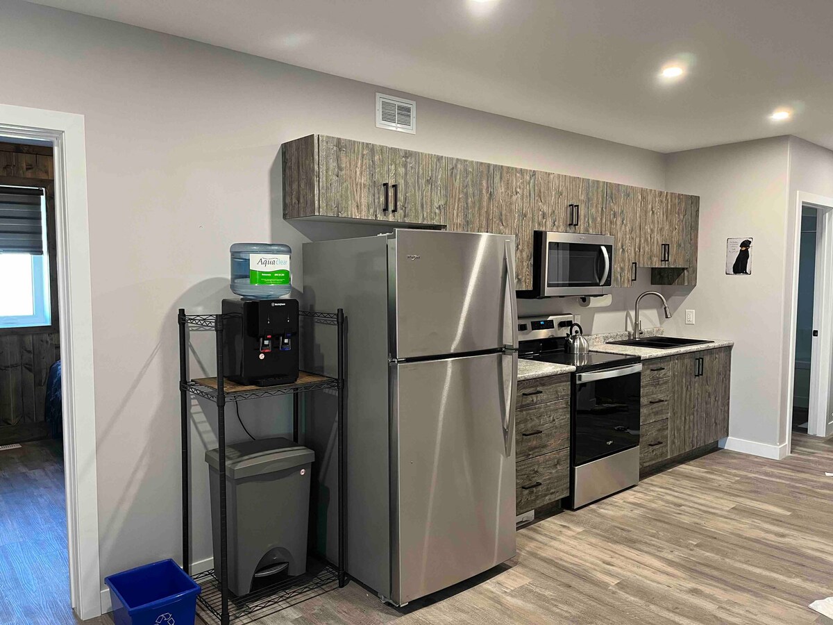 This unique place has a style all of its own! The apartment was once one large classroom and now it has 2 spacious bedrooms with queen size beds, a bathroom, and an open plan, well-stocked kitchen and living room, with private access to a laundry and 2nd bathroom on a lower level. Toiletries and slippers make for a cosy stay. Pelican Lake is a few mins walk, as is the Motor Hotel (beer store), a grocery store, (gas stn. & liquor mart), a Lounge & Restaurant, Bait Store, and post office.