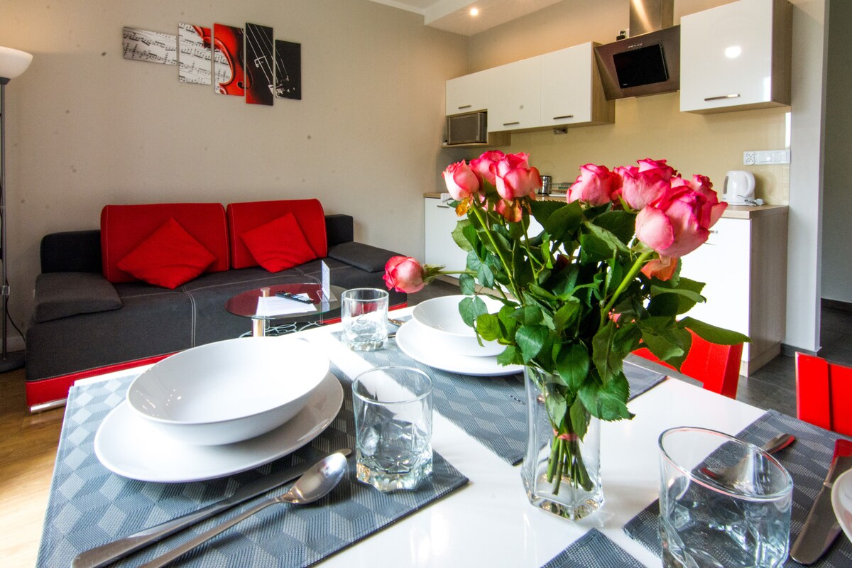 Klimatyczny apartament o wysokim standardzie, położony w kamienicy w centrum Bolesławca, 450 m od rynku. Spacerkiem przez park to tylko 5 minut. Duży salon połączony z jadalnią i funkcjonalnym aneksem kuchennym to idealne miejsce do spędzenia wolnego czasu. Osobna sypialnia z dużym 2 osobowym łóżkiem, rozkładaną w salonie kanapą na 2 osoby dają możliwość zatrzymania się dla 4 osób. Apartament wyposażony we wszystkie niezbędne sprzęty i naczynia oraz środki higieny. Bezpłatne WiFi.