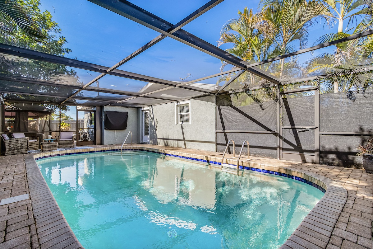 Welcome to sunny Cape Coral! At Palaco Paradise, enjoy an AMAZING HEATED POOL with sun on the lanai all afternoon. Grill out, relax, or head 30 mins to Fort Myers Beach—beach gear included! Stay 4+ nights for FREE waterpark passes. Fish from the backyard or take a 5 MINUTE BOAT DRIVE TO THE RIVER from your own personal dock! Fresh coffee is ready when you arrive, and you're just 35 mins from the airport. Everything you need, nothing you don’t—just sunshine, water, and pure relaxation!