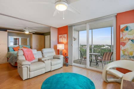 Beautiful newly built spacious studio in downtown Bonita Springs, 7 miles from the world famous Barefoot beach, and only 100 steps away from the popular Riverside park where many events and festivals are held. This spacious studio is modern with a very tall ceiling with exposed wood beams, well lit with giant slider doors, with a full sized kitchen and full patio area. Perfect for a couple on a get-away or even a single person just traveling for leisure or work. Clean at all times.