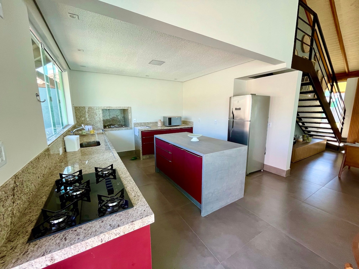 Casa linda e espaçosa, com decoração em estilo rústico. A sensação de uma casa de campo com o conforto da cidade! Amplo quintal com maravilhosa piscina, área gourmet com churrasqueira e muito verde. Duas amplas suítes com cama king, ar condicionado, TV e saída independente para varanda externa, mais um quarto com duas camas king size, uma cama de solteiro, TV, ar cond. e espaço de estar. Banheiro social, sala de jantar sala de TV, cozinha totalmente equipada, três varandas, área de serviço.