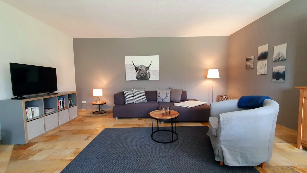 Die Wohnung im Erdgeschoss befindet sich in einem ehemaligen Bauernhaus und wurde komplett neu eingerichtet. Sie eignet sich für 2 - 3 Personen. Das Haus verfügt über einen grossen Garten mit verschiedenen Sitzplätzen zur Mitbenutzung, sowie eine Garage im Haus. In näherer Umgebung gibt es Einkaufsmöglichkeiten für den täglichen Bedarf. Der Stadtpark (Japanischer Garten) neben dem Freibad ist in 5 Minuten zu Fuss erreichbar.