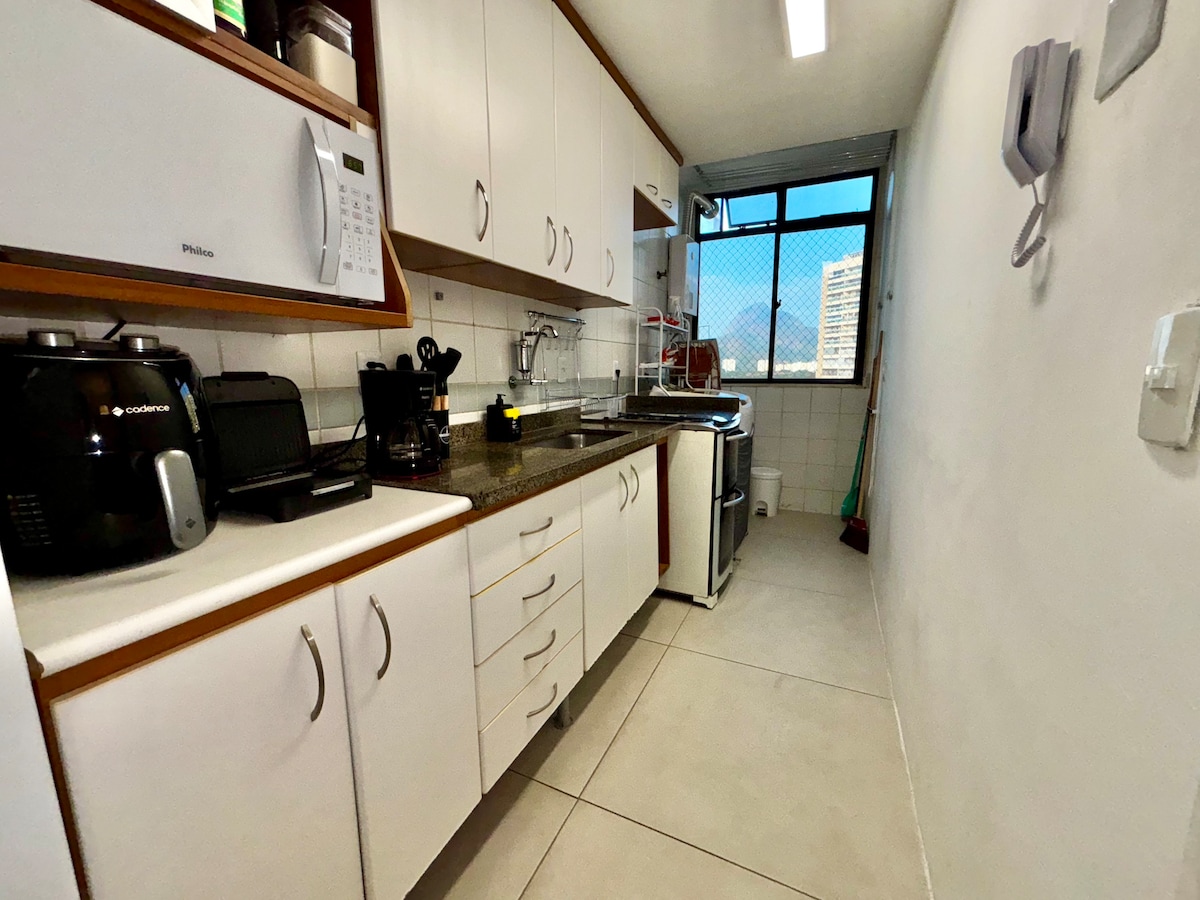 Բնակարան ՝ •Լիովին կահավորված խոհանոց ։ • Աշխատանքի և ինտերնետի գրասենյակը ՝ 500 մբ ։ • Երկարաժամկետ այցերի համար իդեալական փոքր լվացքատուն և մաքրման տարածք ։ • Գազի լոգարան, մեծ ճնշում ։ • Ճաշասեղանով տարածք ։ •Գեղեցիկ տեսարան ։ Գտնվում է «Ռիո2» պլանավորված և անվտանգ թաղամասում ։ Շատ մոտ է Arena Carioca - ին, Centro Metropolitano - ին, Río Centro - ին և Barra da Tijuca - ին: Համալիր՝ ընդարձակ ենթակառուցվածքներով (լողավազան, ֆիթնես կենտրոն, սաունա, ռեստորան, շուրջօրյա ընդունարան և այլն) Առաջարկվում է անկողնային և լոգարանի սպիտակեղեն ։