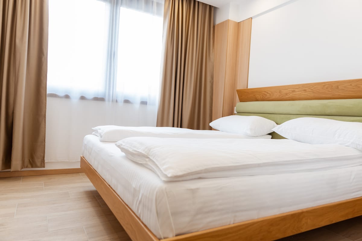 The elegant 125 m² apartment with its own private balcony offers a warm and welcoming atmosphere, perfect for families, couples, or small groups. It features two inviting bedrooms—one with a spacious king-size bed designed for ultimate comfort, and the other with two cozy twin beds. A bright living room with a dining area provides the ideal space for relaxation or quality time together, while the fully equipped kitchen makes preparing meals effortless and enjoyable.