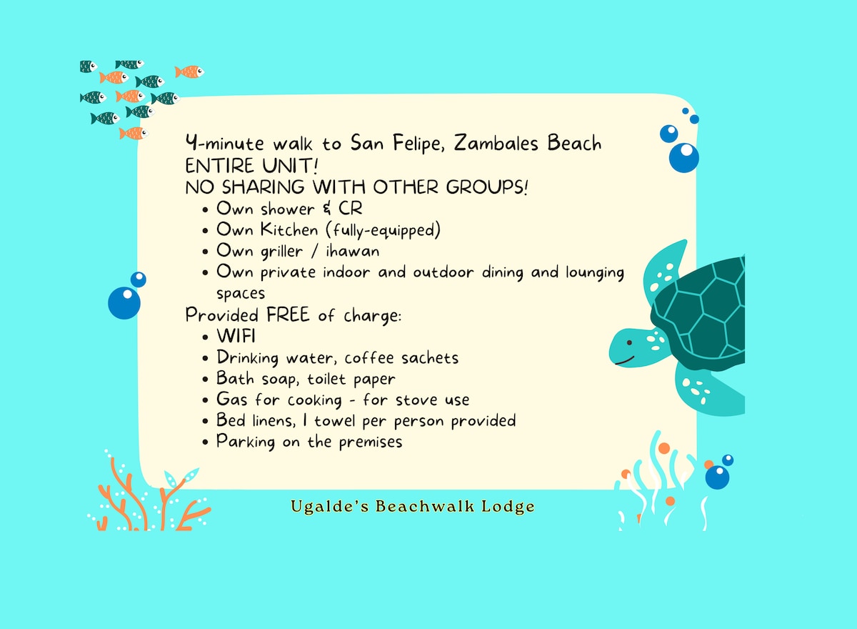 📍2-minute walk to San Felipe, Zambales Beach 📍just a kilometer away from the popular Liwliwa Beach ◆ Air-conditioned unit ◆ NO SHARING WITH OTHER GROUPS! - Own toilet and shower - Own Kitchen (fully-equipped) - Own griller - Own outdoor space ◆FREE onsite parking --------------------- Welcome to Ugalde's Coastal Cabins - Unit A! LOCATION: 15°03'39.6"N 120°03'40.9"E (Copy and paste into Google Maps.)