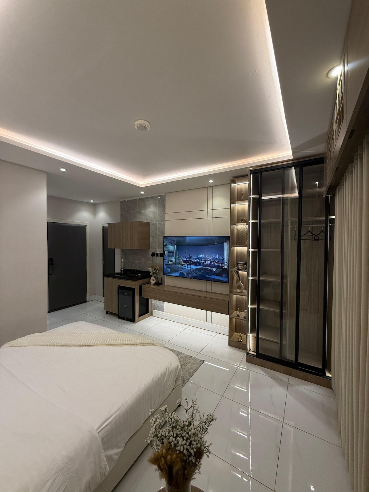 Luxury Apartment with Self-Entry consisting of a bedroom, living room, kitchen, and a fully equipped bathroom (shampoo, slippers, one-time use towels, tissues). • Stunning Boulevard view in Hittin, North Riyadh… The location is ideal, close to major events such as Riyadh Season, Diriyah Season, and all essential services like restaurants and shopping. Specifically: -Boulevard City 1 minute walking -Boulevard World 7 minutes walking -Arena Stadium 8 minutes walking -KAFD 12 minutes driving