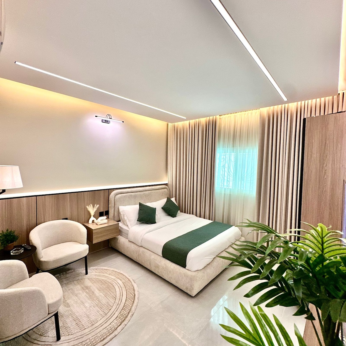 Enjoy a stylish experience at this North-located place in Al Malqa. Comes with smart lock and door isolation for extreme comfortable stay. Located in the north of Riyadh and just 20 minutes from the airport, 5 minutes from Riyadh season entertainments zones and 10 minutes from Al-Diriyah historic town. The apartment comes with high speed fiber internet, 65 LED 4K TV, KING size bed with extra mattress pad for comfortable sleep and free parking.