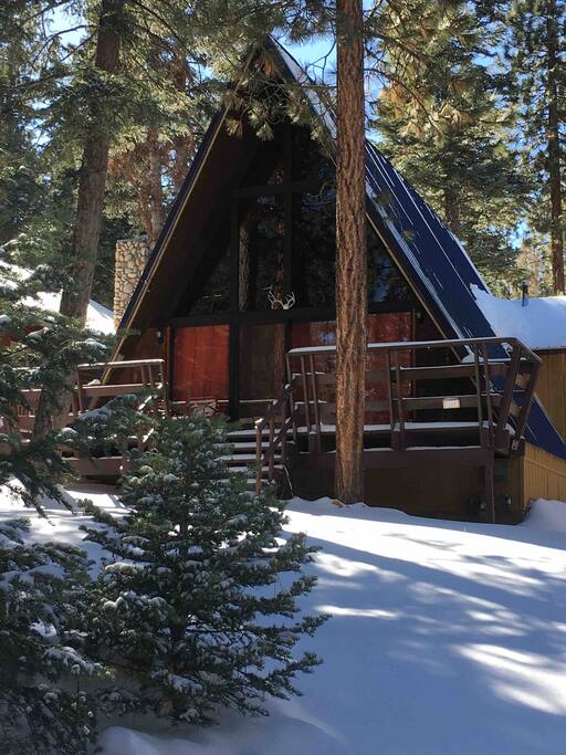 This perfect little Aframe cabin backs the forest! Hiking, biking & the view is what you'll have direct access to at this mountain retreat. Located on a quiet street near Bear Mt. Ski Resort,tucked into the trees, you'll find this mid-century modern cabin.If you are looking for a romantic hide-away,a double couple adventure or a place for your besties to re-connect & unwind, this truly is the coolest cabin in Big Bear Lake.Highly sought after cabin, it will book up fast!Not for children under 6.