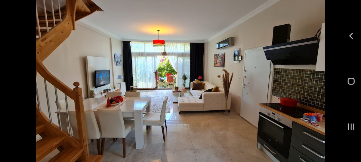 Որպես EnsVillas - ի ընտանիք ՝ ուրախ ենք հյուրընկալել ձեզ ՝ մեր հարգարժան հյուրերին, մեր Ens Apartment - ում ։ Մեր երկհարկանի բնակարանը գտնվում է մեր երկհարկանի շենքի և 1+1 բնակարանի պարտեզի հարկում ։ Այն ունի առանձնացված այգի և պատիո, որտեղ կարող եք հաճելի ժամանակ անցկացնել: Ոտքով 3/4 րոպե մինչև ծով ։ Ձեզ հարկավոր կլինի մթերային խանութ, կանաչեղենիխանութ, դեղատուն,ռեստորան ՝ 5/10 րոպե հեռավորության վրա: Եթե մնաք կենտրոնում գտնվող այս վայրում, ընտանիքի պես մոտ կլինեք ամեն ինչին ։