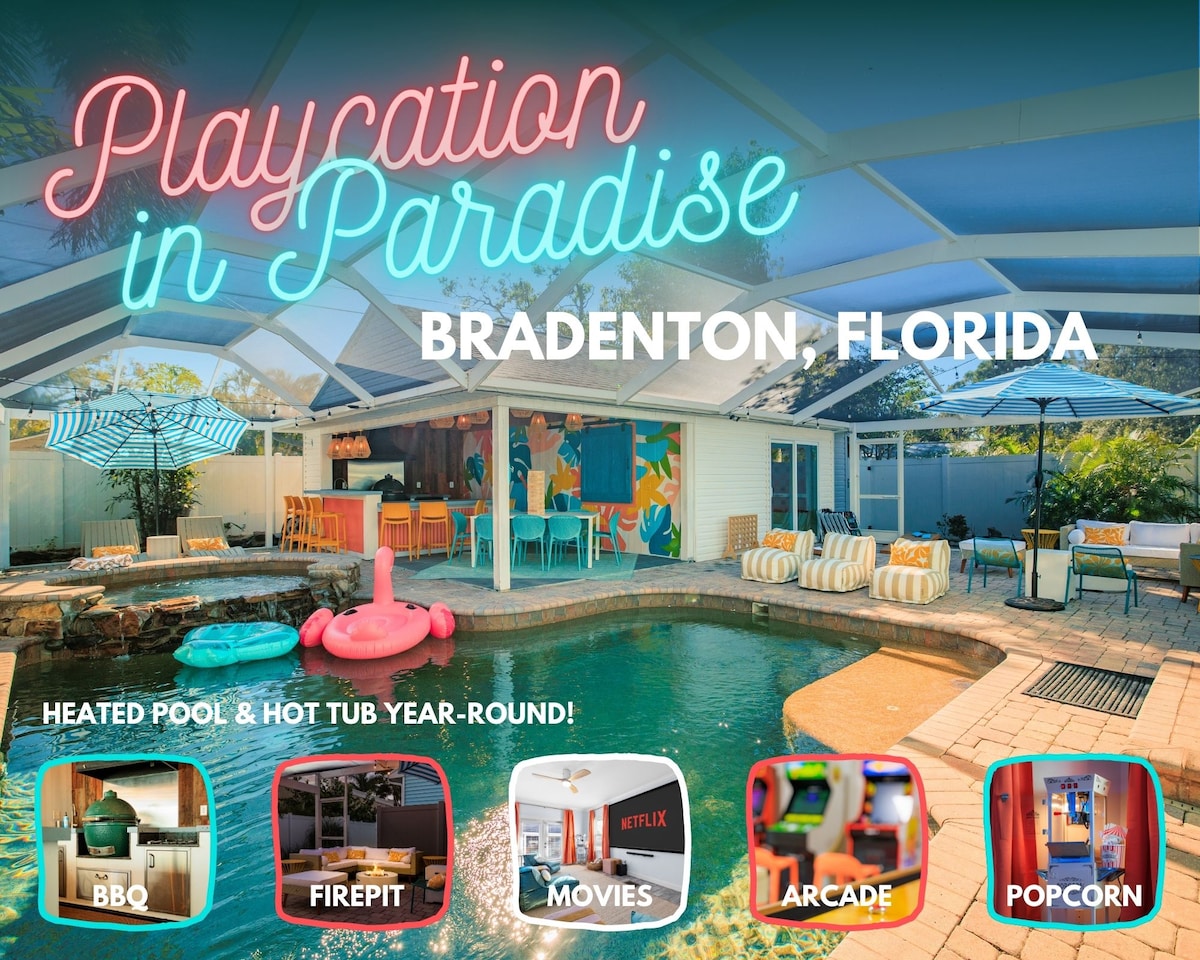 Բարի գալուստ Playcation in Paradise Բրեդենտոնում ՝ Աննա Մարիա կղզուց ընդամենը 15 րոպե հեռավորության վրա ։ Այս 4 մահճակալով, 3,5 լոգասենյակով տունն ունի ջեռուցվող լողավազան, ջակուզի, բացօթյա խոհանոց ՝ խորոված ծխողով, կրակարան և խաղասենյակ ՝ արկադային դասական սարքերով ։ Վայելեք ընտանեկան ֆիլմերի գիշերները 120 դյույմանոց մեծ էկրանին կամ պատրաստեք լավ կահավորված խոհանոցում: Ննջասենյակներ (K, K+Ամբողջական բազմոց, 2Q, 2 - Full մահճակալներ )՝ Leesa մահճակալներով և այնպիսի հարմարություններով, ինչպիսիք են գերարագ ինտերնետը, լողափի հանդերձանքը և ադիբուդիը ։ Կատարյալ է Ֆլորիդայում հանգստանալու, զվարճալի հանգստի համար ։