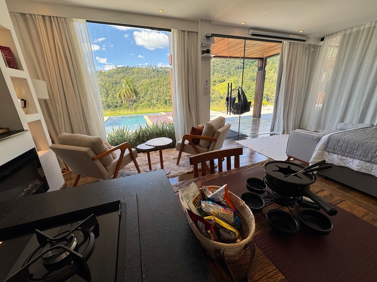 Estamos na Serra do Lopo que faz parte da Mantiqueira próximo a Extrema em frente a Rodovia Entre Serras e Águas (asfaltada), o chalé fica na beira da mata com toda privacidade e conta com duas piscinas EXCLUSIVAS do chalé, ideal para você relaxar depois de uma caminhada e no inverno tomar um vinho do lado da fogueira ou apenas ficar quentinho ao lado da lareira.