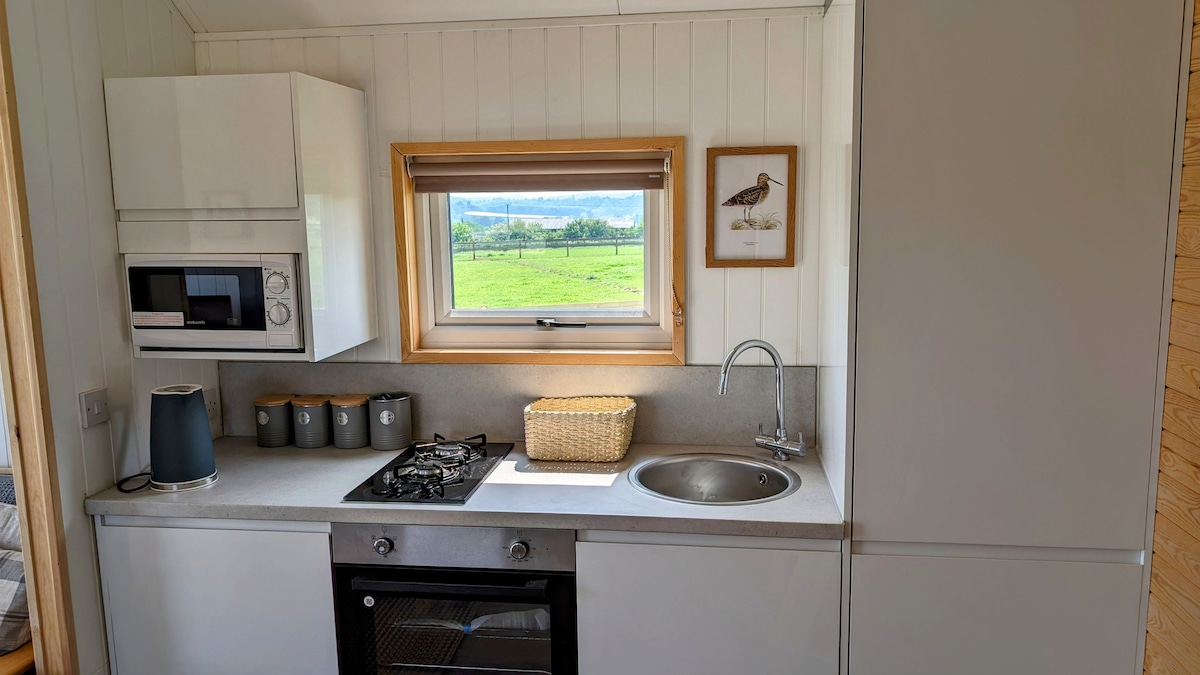 Get away from it all in a cosy shepherd’s hut amongst trees in a beautiful rural location. Tom's Hut has a comfortable double bed, storage below and a compact kitchen unit with double gas hob, sink and fridge, pots, pans crockery and cutlery. Keep warm with a wood-burner and fire wood provided, or underfloor heating. Outside, there is a table for al-fresco dining. A newly built, heated shower room is close to the hut. Just 3 miles from Newent and various pubs. Please note there is no WiFi.