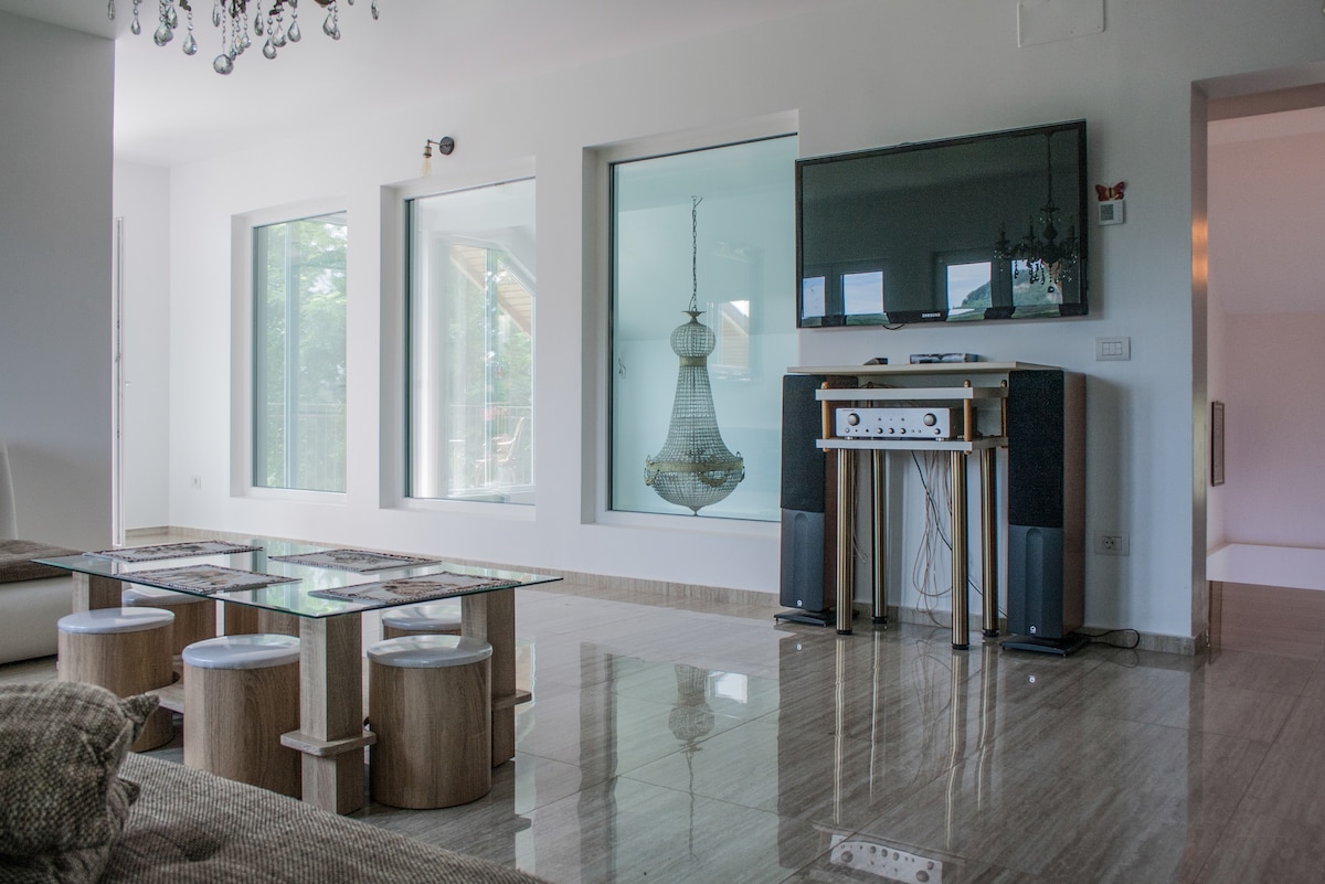 Glamorous villa located on the hills of Prahova Valley, offers accommodation spaces of 4 spacious and bright bedrooms, 4 bathrooms, living room with a fireplace-lounge area, a dining area and an ultramodern kitchen. The place is located between Breaza and Comarnic, just 30 minutes away from Sinaia ski slope and only 1 hour away from Bucharest. The clean air of the orchard and the rustic atmosphere make this place an oasis of relaxation.