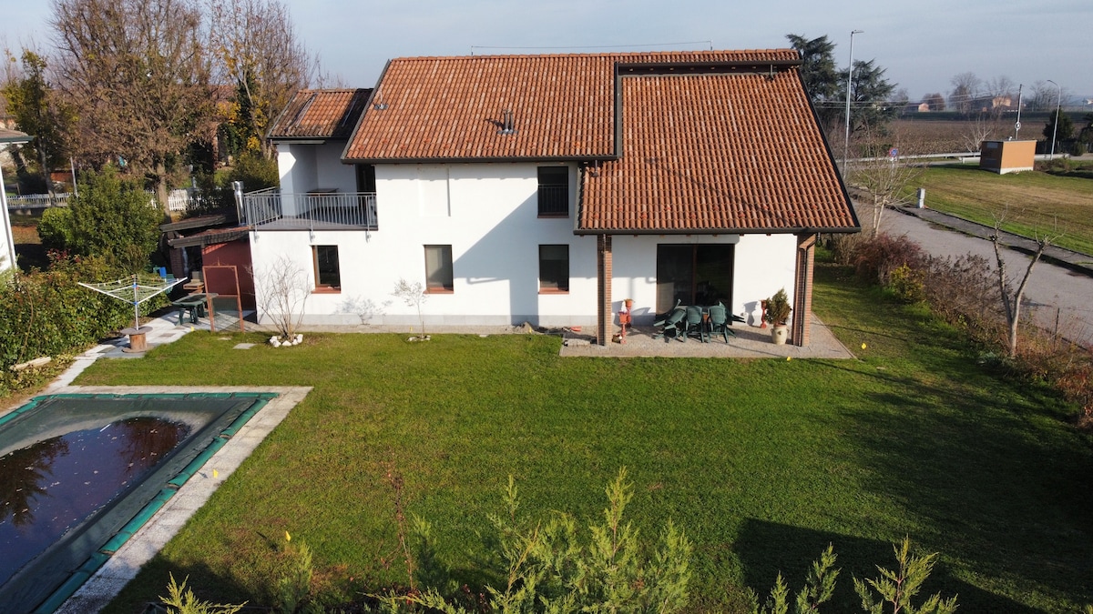 L'alloggio è una casa indipendente, composta da soggiorno con divano e TV, cucina attrezzata e dotata di elettrodomestici e stoviglie, due camere matrimoniali ciascuna con il proprio bagno completo di servizi e doccia. Non mettiamo in condivisione gli ospiti. Esternamente c'è un giardino privato e un ampio spazio cortilizio dove poter parcheggiare in sicurezza i mezzi di trasporto. La zona è molto tranquilla e silenziosa, vicinissima ad una pista pedonale e ciclabile in riva al fiume Po.