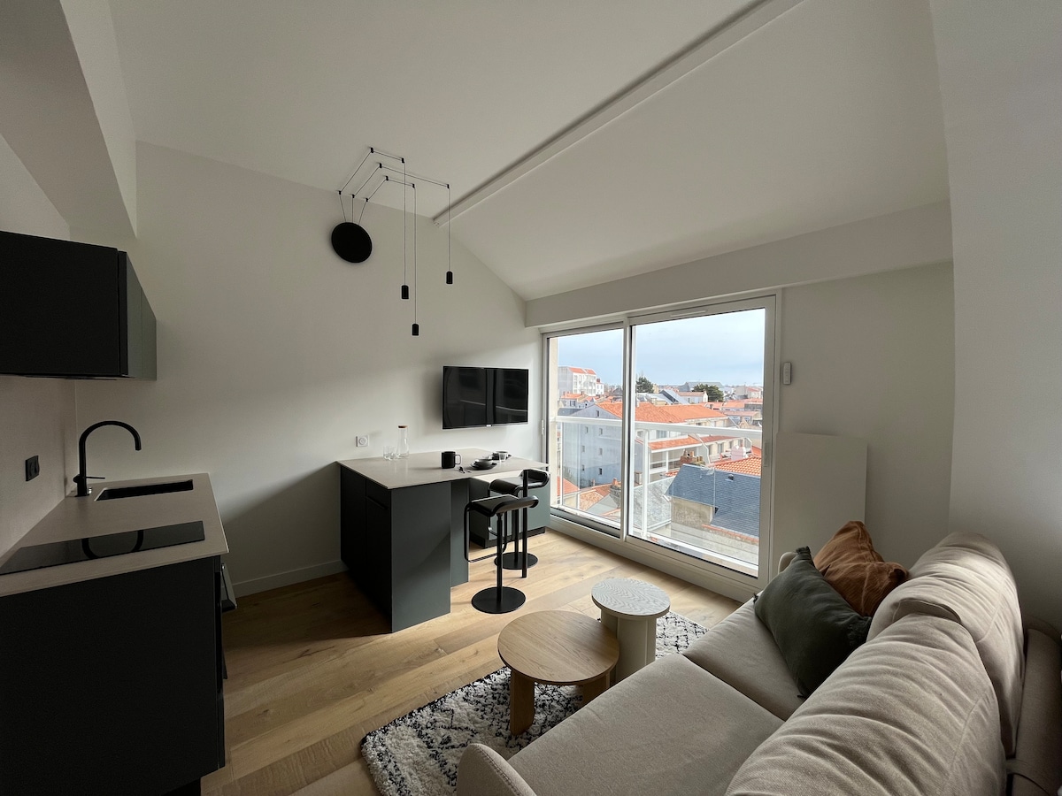 Bienvenus aux Sables ! Joli studio de 32 m2 situé au 7ième étage d'une résidence de standing en plein coeur du remblai. Une vue splendide face à l'océan, sur toute la partie droite de la baie et l'entrée du chenal. La plage et le remblai à quelques pas ! Pour votre confort, une place de stationnement gratuite vous est réservée durant la saison estivale sur juin/juillet/août. Parking à 10mn à pied du logement. Tout est prévu pour vous accueillir dans les meilleures conditions. À bientôt !