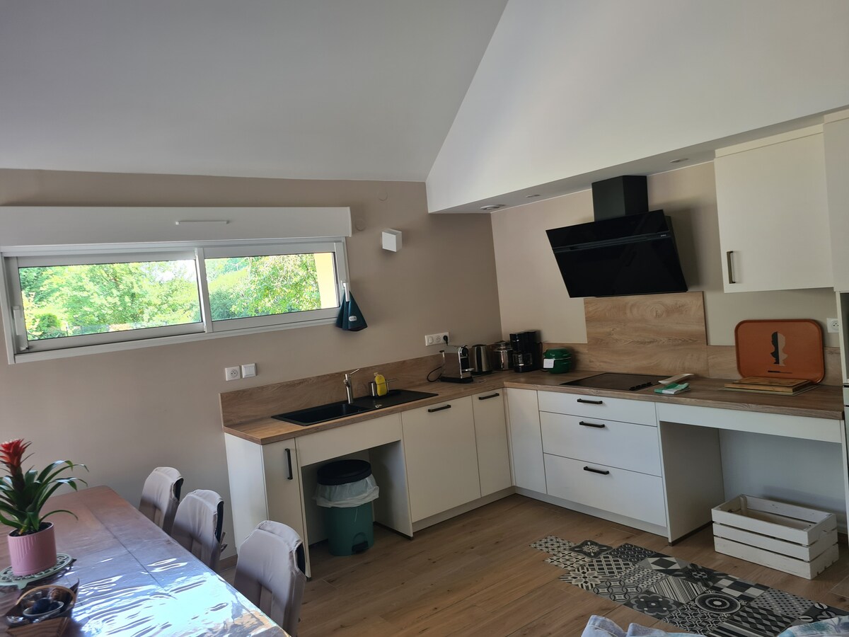 A seulement 10min du circuit ! Offrez-vous un séjour dans notre loft spacieux et baigné de lumière, parfait pour 8 personnes. Profitez d'un grand séjour ouvert, d'une cuisine entièrement équipée et d'une salle à manger conviviale. La chambre parentale avec baignoire balnéo vous invite à la détente après une journée bien remplie. Idéal pour familles ou amis. Nous vous avons installé une table extérieure dans un espace de verdure totalement dédié pour vous ! Arrivée autonome