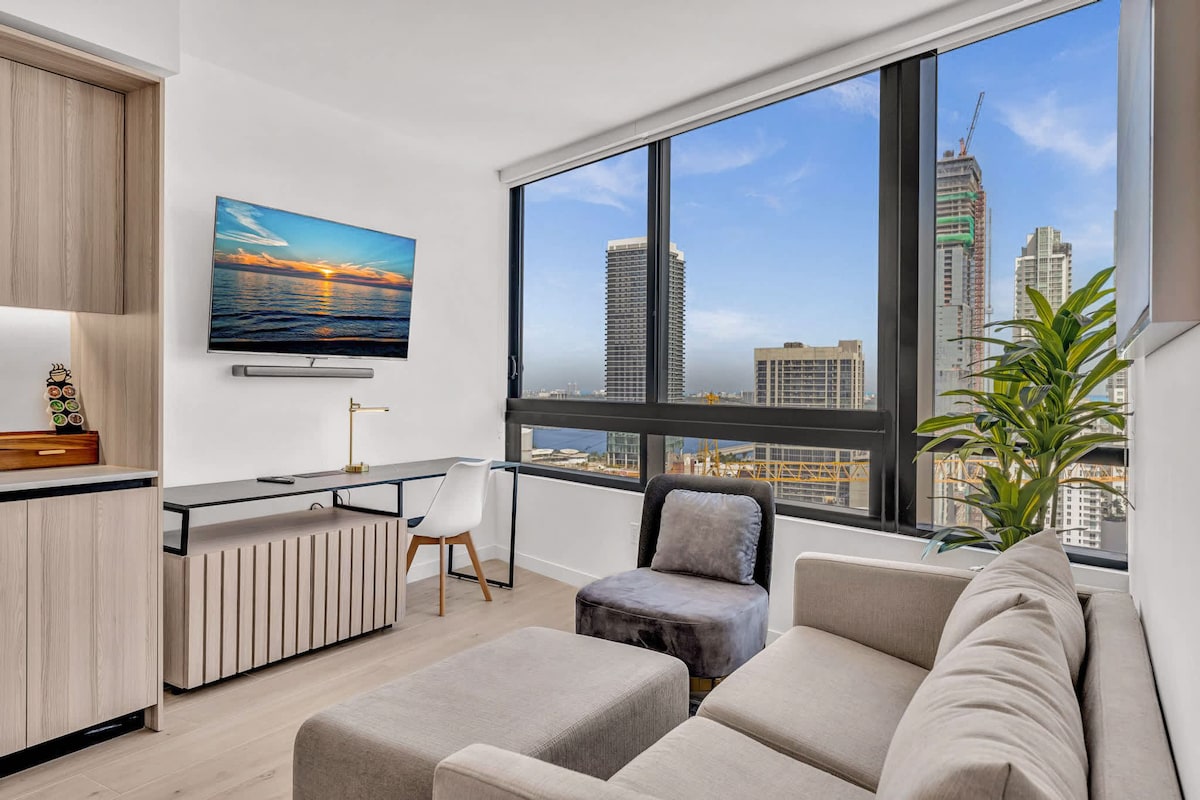 Modern Miami Studio with stunning views! Enjoy a cozy space with a King Size Bed, Smart TV, fast WiFi, and a private balcony. Perfect for relaxing after exploring the beach, nightlife, and top dining spots nearby. Located across the street from Bayside Marketplace Waterfront. Includes a kitchenette, central AC, and secure building access. Ideal for solo travelers or couples seeking comfort and style in the heart of Miami. Book your escape today 🌴