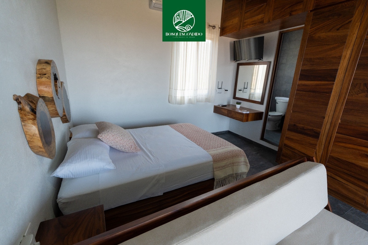 Մասնավոր ստուդիա ՝ շրջապատված բնությամբ, որտեղ դուք կվայելեք հանգիստ և աստղալից գիշերներ: Սենյակը լիովին անկախ է, ունի տաք ջուր, 150 -179 սմ մահճակալ Այն ունի սրճեփ մեքենա, մինիբար, բլենդեր և անհրաժեշտ պարագաներ ՝ պարզ նախաճաշ կամ ընթրիք ունենալու համար: Այն նաև ունի հատուկ տարածք դրսում, որտեղ կարող եք լվանալ սպասքը և չորացնել սրբիչները: Հասարակական տրանսպորտից օգտվելը շատ հեշտ է, և մենք գտնվում ենք Պուերտո Էսկոնդիդոյի կենտրոնից 10 րոպե հեռավորության վրա