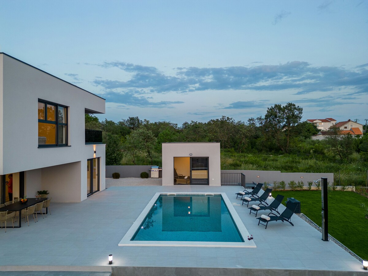 Այս գեղեցիկ վիլլան գտնվում է հանգիստ թաղամասում և շրջապատված է գեղեցիկ բնությամբ ։ Մենք մոտ ենք Նին քաղաքին և տարածաշրջանի ամենասիրված լողափին ։ Զադարի քաղաքապետարանը մեքենայով գտնվում է 15 րոպե հեռավորության վրա ։ Տունը կատարյալ վայր է ավելի մեծ ընտանիքների և խմբերի համար ։ Այն շատ ընդարձակ է և ժամանակակից կահավորված ։ Վիլլան բաղկացած է հինգ ննջասենյակից, երեք լոգասենյակից, հյուրասենյակից ՝ ճաշասենյակով, ջեռուցվող լողավազանից և բացօթյա խոհանոցից ։ Մեր հյուրերն ունեն անվճար կայանատեղ, Wi - FI և գրիլ ։