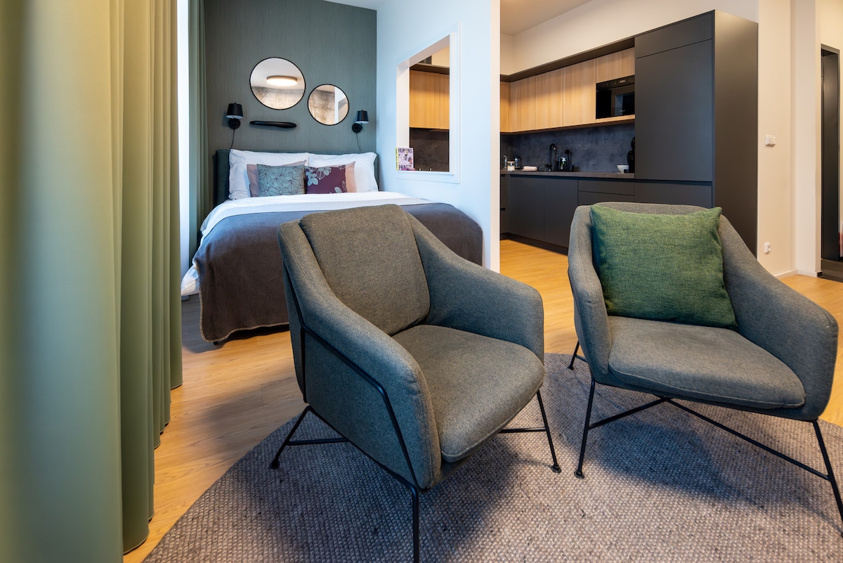 Stay in a generously sized 45 m² studio apartment in the heart of Brno, tucked away in a quiet inner courtyard that offers peace away from street noise. Enjoy Free Underground Parking, a complimentary minibar, and a 24/7 reception for flexible, stress-free arrival. This brand-new premium studio-apartment in the Pekárenský Dvůr residence features a fully equipped kitchen, custom-built-in furniture, fast Wi-Fi, gym access, an excellent bakery/café on site, and optional wellness services.