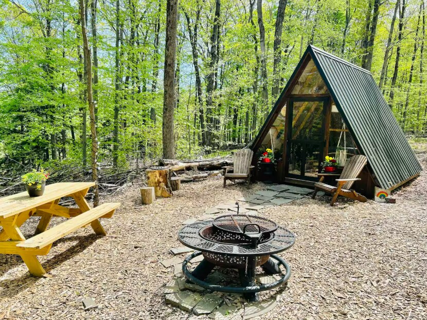 Unforgettable nature escape at Escapology! Embrace peace amid beautiful foliage with your pet by your side. Primitive charm, basic amenities, queen size bed, and coffee essentials provided as well as a basic supply of water for camp use. Start a campfire under the stars with firewood available for purchase. Reconnect with simplicity and serenity here. Explore NY River Adventures @ Tall Pines (5.6 miles) with kayaks or unwind with a refreshing cider at Awestruck Ciders (3.4 miles).