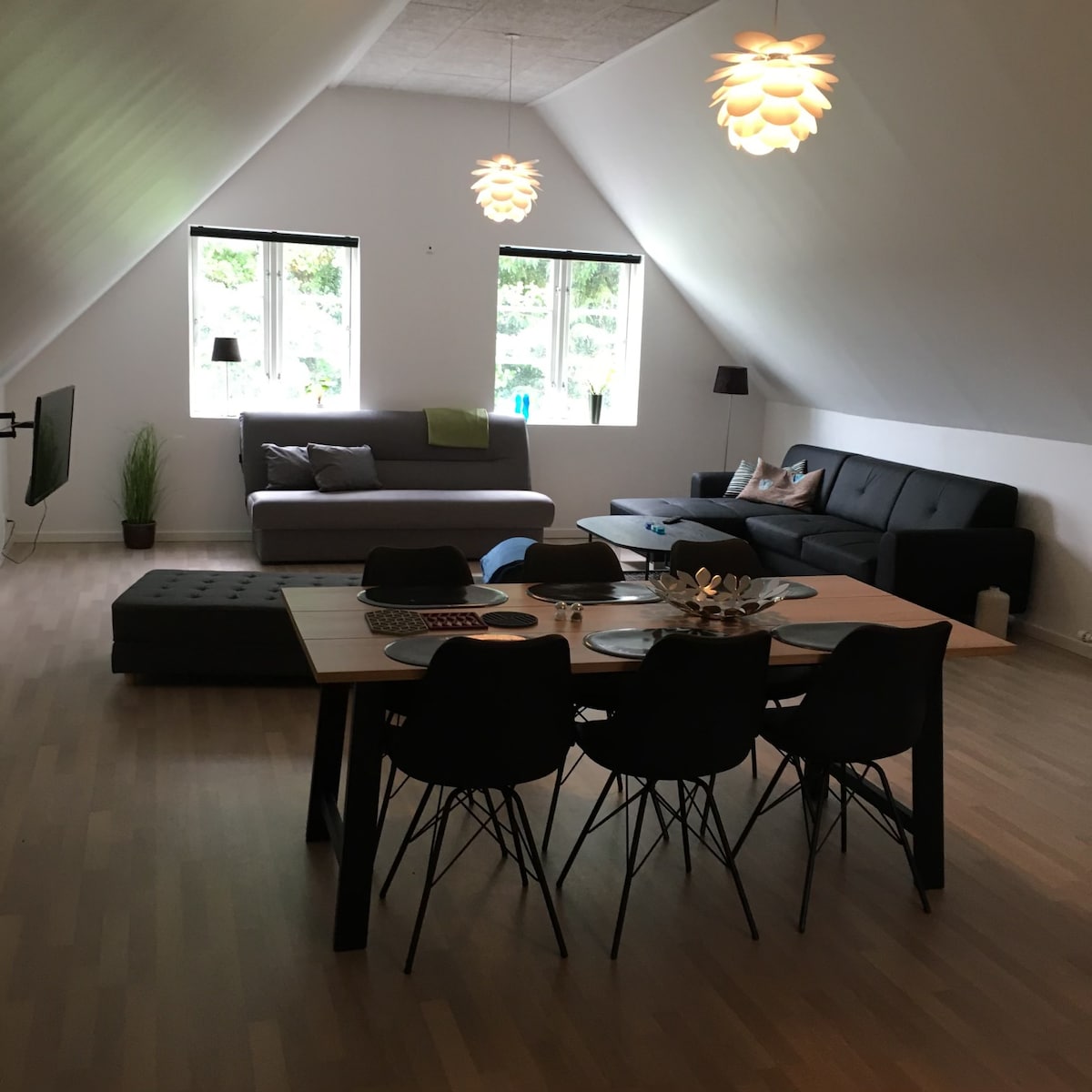 Վայելեք Քոլդինգ ֆյորդի ցնցող տեսարանները այս լուսավոր 110 մ² մակերեսով առաջին հարկի բնակարանից ՝ հմայիչ սպիտակ պատրիկյան վիլլայում: Առկա է 2 երկտեղանի ննջասենյակ, մեծ լոգասենյակ, հարմարավետ հյուրասենյակ և լիովին կահավորված խոհանոցային ճաշասենյակ ՝ արևի սպասքով առանձին տեռասով ։ Մենք հանգիստ ապրում ենք առաջին հարկում և հարգում ենք ձեր գաղտնիությունը ։