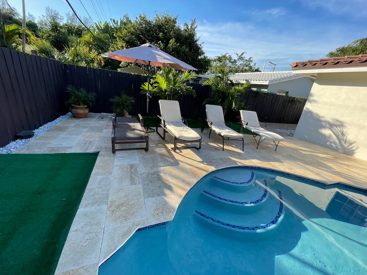 Եկեք և մնացեք մեր գեղեցիկ հանգիստ և մասնավոր հյուրատանը: 2 մահճակալ և 2 լոգասենյակ ՝ հյուրասենյակում բազմոցով, առանձին մուտք և պատիո, քայլելու հեռավորություն դեպի լողափ, Galleria Mall, Publix, Ռեստորաններ, բարեր, սրճարաններ, կինոթատրոններ, զամբյուղի գնդակով զբոսայգիներ, թենիսի կորտեր և հասարակական տրանսպորտ: Աշխարհահռչակ Լաս Օլաս Բլվդից 10 րոպե հեռավորության վրա և ջրային տաքսիից մեկ թաղամաս, որը հարմարավետորեն տանում է ձեզ դեպի այս բոլոր հիանալի վայրերը : Լավագույն վայրը Ֆտ Լոդերդեյլում: