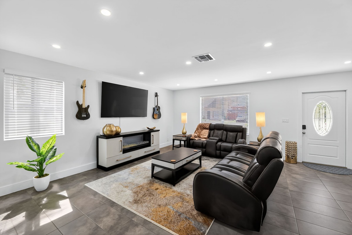 This unique place has amazing style!! Enjoy your own personal TEN-FOOT movie theatre that drops from the ceiling at the touch of a button! Want to relax? A luxurious couch equipped with heating, 4 power recliners w/ massage functions, temp-glow, and all refrigerated cup holders is there to assist! State-of-the-art lighting embedded INSIDE walls, wave-to-illuminate LED’s in the kitchen, and motion controlled lights in various areas to name a few. Centrally located and 3 miles from beach!