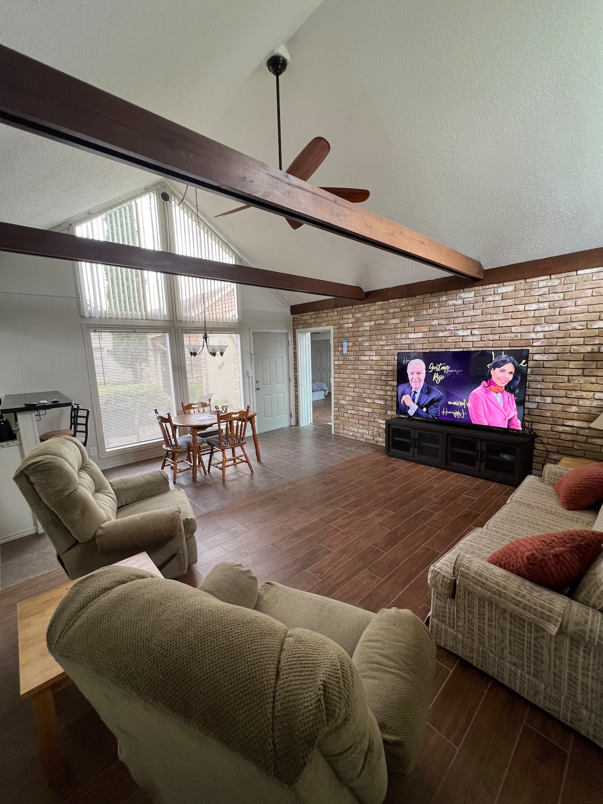 Բարի գալուստ Վիլլա, Սան Անդրես ։ Կենտրոնում գտնվում է սրտում Brownsville, այս նոր վերանորոգված եւ լավ նշանակված 2 ննջասենյակ, 1.5 բաղնիք հպարտանում է բաց հատակագիծը, որը կատարյալ է ընտանիքի եւ ընկերների հետ հանգստանալու հետո երկար օր լողավազանում & ջակուզի! Հագեցած WIFI միացված խելացի հեռուստացույցներ, լվացքի մեքենա/չորանոց, գրասենյակային անկյուն, եւ բակային բացօթյա պատիո տարածքում նայող առաջին կանաչ է 9 փոս պար 3 գոլֆի դաշտում, սա կատարյալ տարածք է աշխատանքի եւ խաղի համար:
