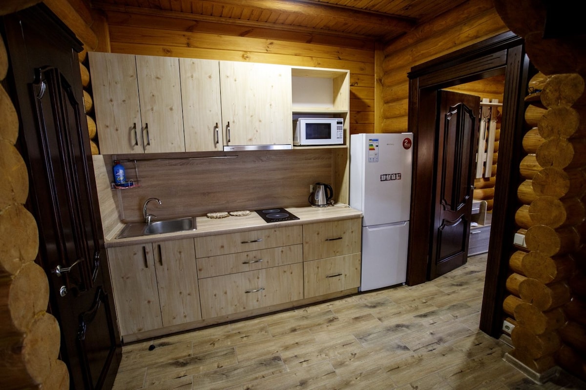 Փայտե էկո տունը գտնվում է Կիևից 40 րոպե հեռավորության վրա ՝ լճի մոտ, շրջապատված է անտառային անտառով: Տարածքը փակ է ։ Անվճար կայանատեղ կա, և հյուրերը կարող են մանղալ օգտագործել լավ խնամված տարածքում ։ Ձկնորսություն հասանելի է լրացուցիչ վճարի դիմաց: Տանը կա խոհանոց, որն ամբողջությամբ հագեցած է սպասքով և սարքավորումներով (էլեկտրական թեյնիկ, միկրոալիքային վառարան, վառարան, սառնարան)