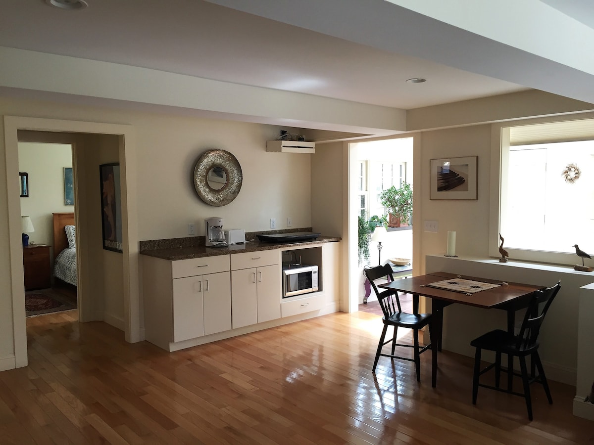 Հանգիստ տուն, որը գտնվում է կեղտոտ ճանապարհի վերջում ՝ բնապահպանական հողի կողքին ։ Թեև կան հարևաններ, լանդշաֆտը ստեղծում է մասնավոր օազիս: Առանձին մուտքով ներքև գտնվող բնակարանը հին Նոր Անգլիան է, որի վրա ազդում է Քեյփ Քոդը ։ Ննջասենյակում կա երկտեղանի մահճակալ ։ Երկրորդ քնելու տարածքն ունի ծովախորշ ՝ տրադիցիոն, և մասամբ բաց է բնակելի տարածքի համար ։ Տախտակամածից դուրս կա գրիլ և ցնցուղ հյուրերի օգտագործման համար ։ Դպրոցական տան լճակին մոտ, հեծանվային ուղի և լողափերից 3 մղոն հեռավորության վրա, գնումներ կատարելու և քաղաքի կենտրոնից ։