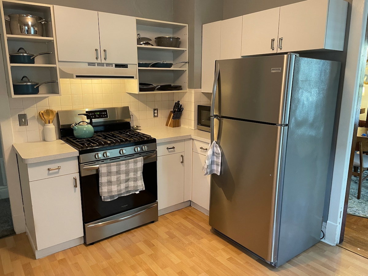 Էլմվուդի վրա ՝ փողոցից դուրս կայանատեղով և առանձին մուտքով ։ Նոր կապիտալ վերանորոգված, ամբողջական խոհանոց ՝ կաթսաներով և թավաներով, սպասքով, սպասքով և այլն, քյորիգ սրճեփ և սուրճ ։ Հյուրասենյակի/ննջասենյակի տարածքում կա բազմոց, աթոռ, գրասեղան, 50" հեռուստացույց և նոր, բարձի երեսով մահճակալ ։ Կարճ զբոսանք դեպի Բուֆֆ Սթեյթ, Օլբրայթ Նոքս պատկերասրահ և բազմաթիվ ռեստորաններ ։ Հիանալի տարածք ՝ հիանալի մարդկանցով, որտեղ դուք ձեզ ապահով կզգաք: Հիանալի, հարմարավետ վայր մի քանի օրով կամ մի քանի շաբաթով: Մենք զգալի զեղչեր ենք առաջարկում երկար այցերի համար ։