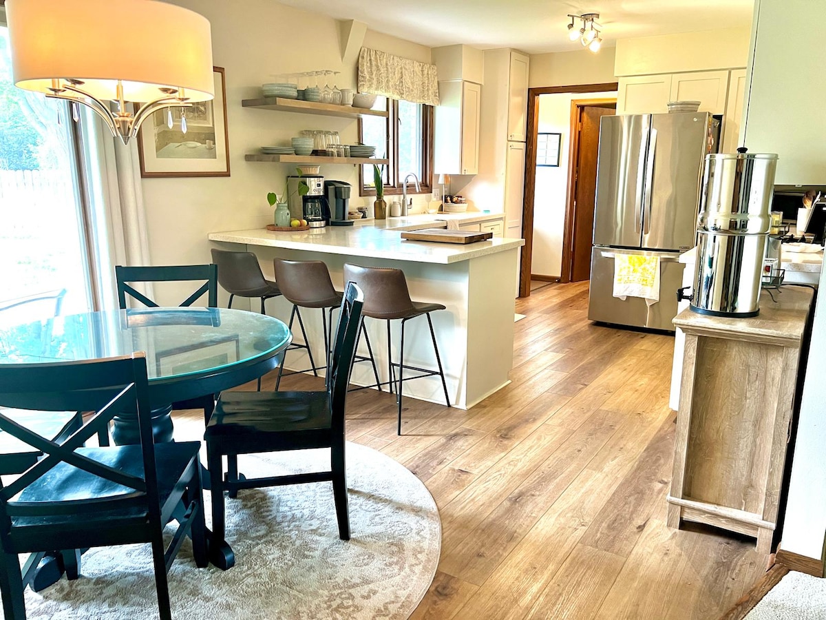 Spacious house near Hutchinson (10 miles) with 4 bedrooms, 2 newly remodeled full baths, well-equipped kitchen and dining areas. Quiet location off the main road but easy access to town. A great spot for family gatherings, girls weekend, or a base for exploring Kansas. Patio, 2-car garage, sunny breezeway, and a big round table for shared meals or games. We have an airbed available if needed.