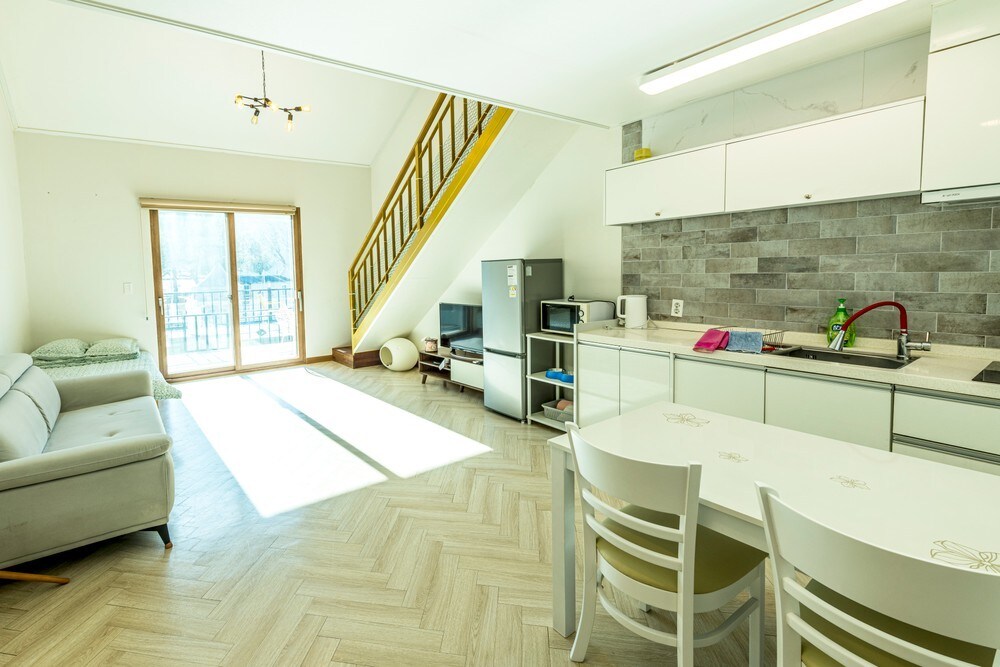 별채로 단독사용이고 유기농마을이라 공기도 깨끗합니다. 귀농하여 유기농으로 농사를 짓습니다 팬션단지 아닌 시골마을이라 시내처럼 큰마트는 없어요. You can use it alone as a separate building. On the 1st floor, there is a living room, kitchen, toilet, and utility room, and on the 2nd floor, there is a dirt bed and deck.When you open your eyes in the bedroom, you can enjoy the sunshine and countryside through the window. The air is clean because it is an organic village. You can hear the sound of unnamed birds. It's a rural village.