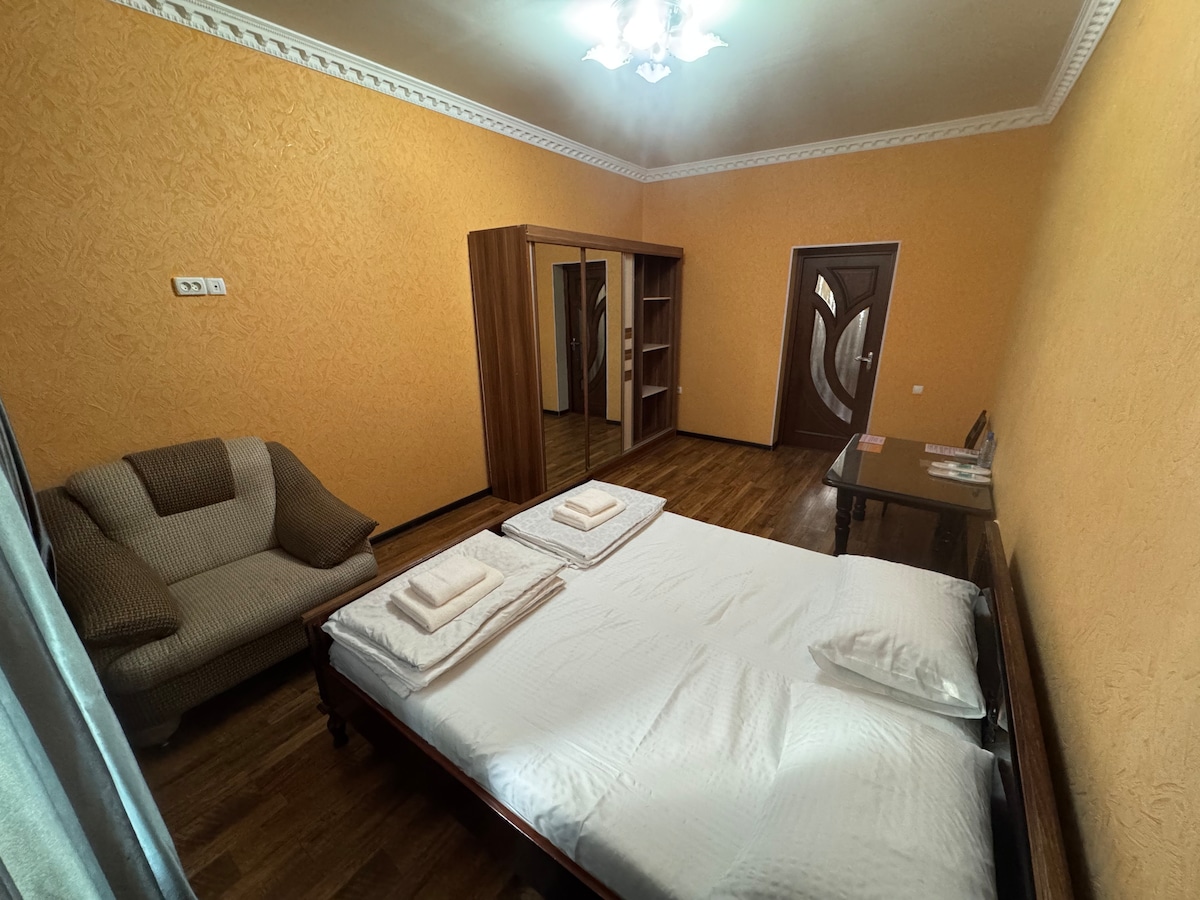 Մեր տունը գտնվում է քաղաքի հենց կենտրոնում. բոլոր տեսարժան վայրերը ոտքով հեռավորության վրա են ։ Սենյակում կա մեծ երկտեղանի մահճակալ, զգեստապահարան, օդորակիչ, ջեռուցում, Wi - Fi, աշխատասեղան, աթոռ և հարմարավետ բազմոց ։ Մեծ սենյակ առաջին հարկում ։ Տունը գտնվում է անաղմուկ փակուղում ՝ կենտրոնական, բայց առանց քաղաքի աղմուկի ։
