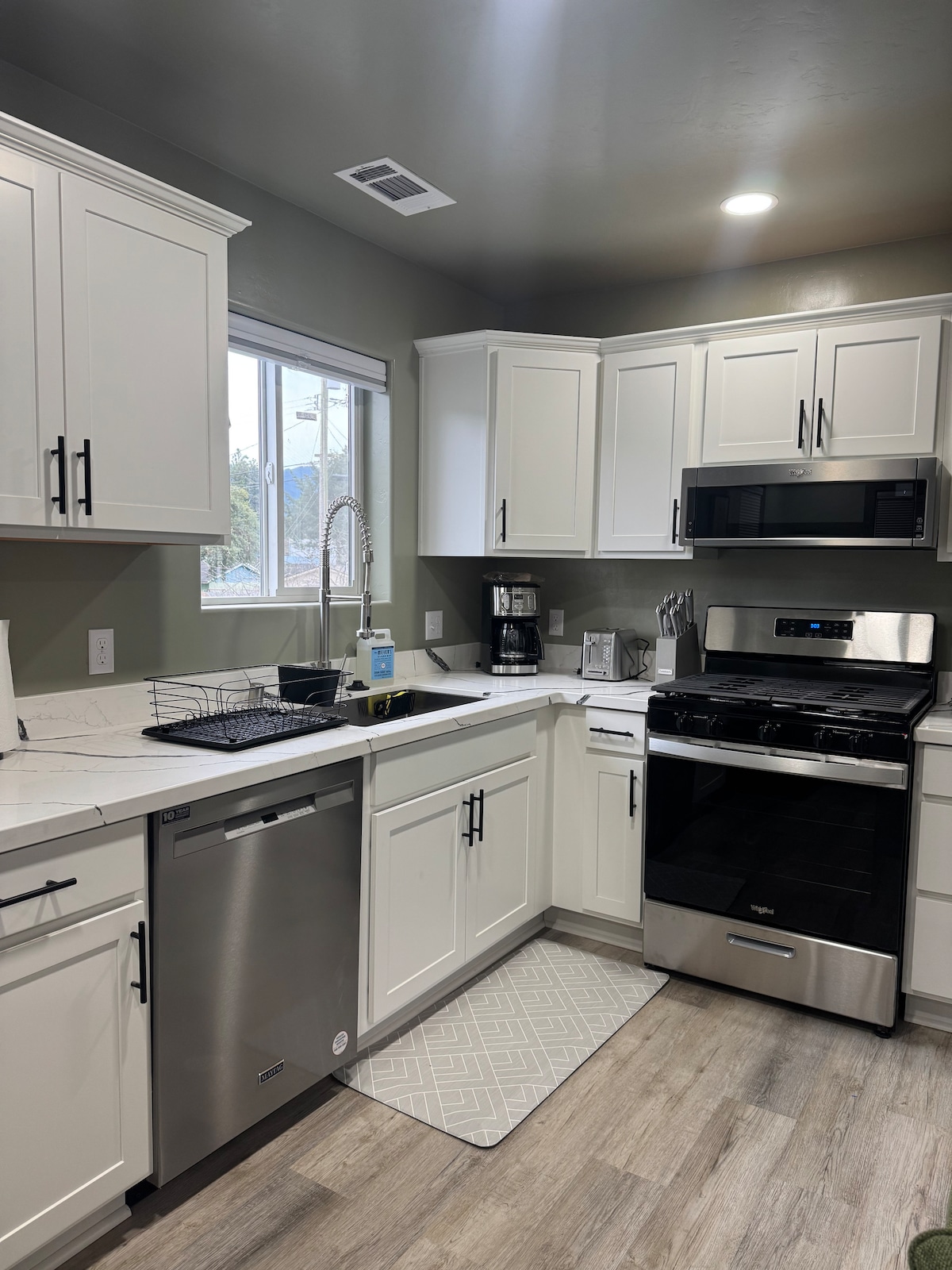 Remodeled cabin nestled in a redwood grove near the south end of the "Avenue of the Giants" in the town of Miranda. Perfect location to unwind after a long day exploring the Avenue. Enjoy the large luxurious tile shower with rainfall shower head & body sprayers, hotel style bed & fully equipped chef's kitchen w/ premium appliances including a Breville Vertuo coffee machine with coffee pods and tea selection. Walking distance to grocery store and restaurants. Fenced back patio w/ pvt hot tub
