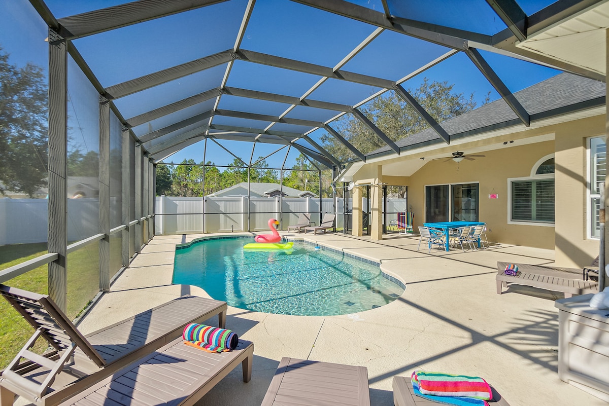 Dog-friendly home with a beautiful yard, patio & WiFi, close to golf and beaches! This single-level, 3-bedroom Palm Coast home is perfect for beachgoers and golfers alike, with world-class courses nearby and beaches like Varn and Flagler just a short drive away. Enjoy central AC, a sunroom with yard views, and a lovely backyard ideal for BBQs or relaxing on the patio. Inside, you'll find a well-equipped kitchen, multiple TVs, and space to unwind. Perfect for your Florida getaway! LBTR 34693
