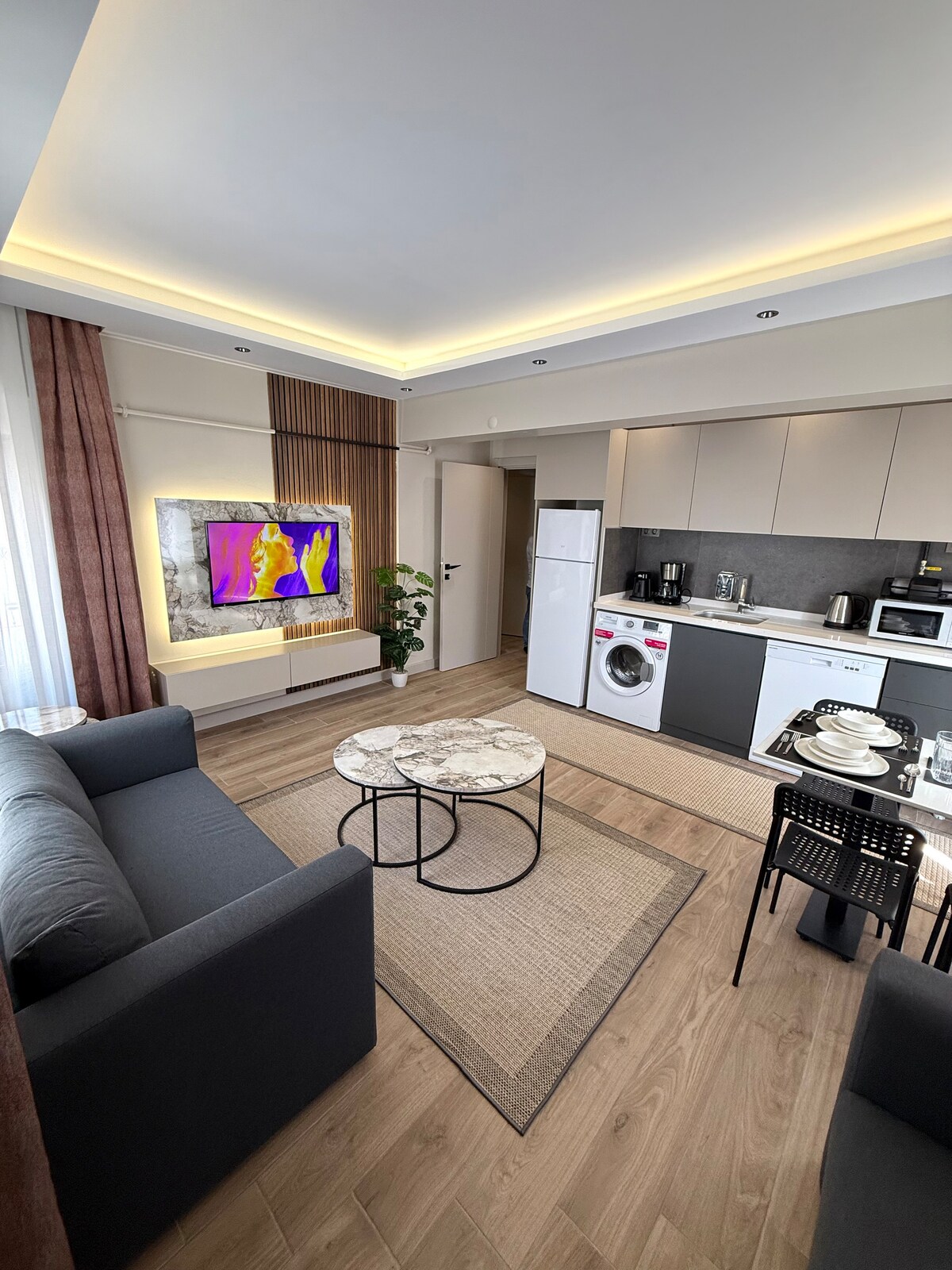 Antalya Konyaaltı Plajına araba ile 4 dakika ve 5M Migros'a 3 dakika mesafede yer alan dairemiz mutfak, salon, yatak odası, banyo, balkon ve döşeli eşyalarıyla konaklama hizmeti vermektedir. 500 Mbps Wifi,Led TV, klima, çamaşır makinesi, bulaşık makinesi,doğal gaz, kombi , petek, ankastre set, mikro dalga fırın, filtre kahve makinesi, türk kahve makinesi, tost makinesi, mutfak malzemeleri, fön makinesi Antalya Akvaryum 3 km Antalya Havaalanı 16 km Antalya Otogar 6 km Süpermarketlere 200 metre