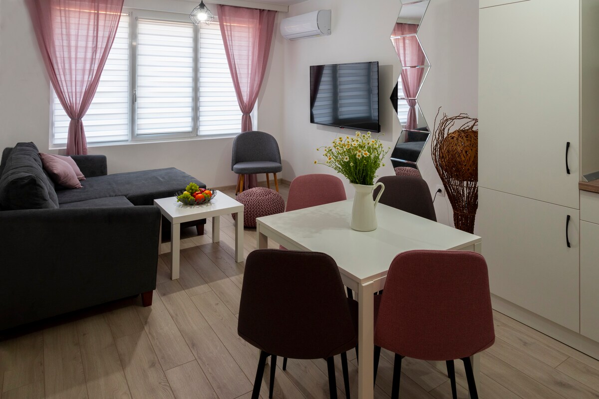 Luxuriously furnished and fully renovated apartment in the heart of Burgas, just steps away from the Sea Garden and the beach. Perfect for a relaxing holiday or a romantic weekend. It offers everything you need – a comfortable bedroom, air conditioning, Wi-Fi, Smart TV, and a fully equipped kitchen. Nearby, you’ll find restaurants, shops, and cultural attractions. Parking is convenient with a blue zone available close by. We look forward to welcoming you for a cozy stay!