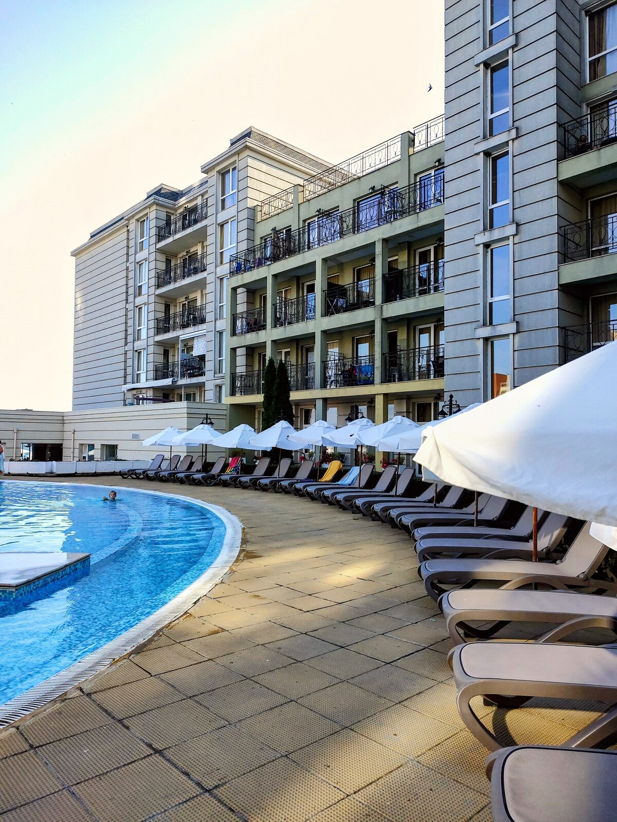 This cozy studio is located in the Festa Pomorie Resort 4-stars hotel complex, with a protected area and a swimming pool. Directly from the owner. The hotel complex is located on the coastline, the terrace offers a beautiful view of the sea and the pool. The studio has everything you need for your stay. There is a king size comfortable bed. It is also possible to make an extra bed for those traveling with children for an additional fee.