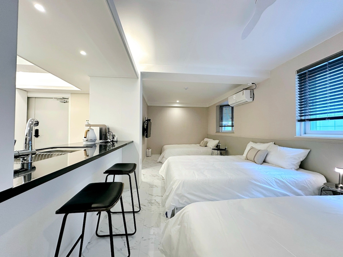 🏖 해운대 비치프론트 호텔식 프리미엄 스튜디오 ☑️ Fully furnished | 단기부터 장기숙박까지 최적 ▪️정수기, 스타일러, 세탁기/세제, 건조기, OTT, 비데 등 ☑️ Ocean & City View | 더블 테라스 ☑️ Modern Open-concept Studio | 호텔식 스튜디오 ☑️ Q침대(160×200) + 소파베드(110×200) ⭐️ 성인3 까지 | 성인3+어린이1 /성인2+어린이2 OK ⭐️ 3인 이상 예약시 소파베드용 침구 무료 제공 ※ 30cm 두께 프리미엄 소파베드로 편안한 숙면 보장 ☑️ Within walking distance | 편의시설 도보 이동 가능 ▪️ 편의점(1층) · 해변(1분) · 올리브영 (7분) · 지하철(7분) ▪️ 전통시장, 해리단길, 동백섬, 마린시티 등 주요 명소 10분 ☑️ 부산 주요 핫플레이스 이동 GOOD ▪️ 광안리해수욕장, 센텀시티, 서면 : 지하철 2호선 라인, 환승없이 10~30분