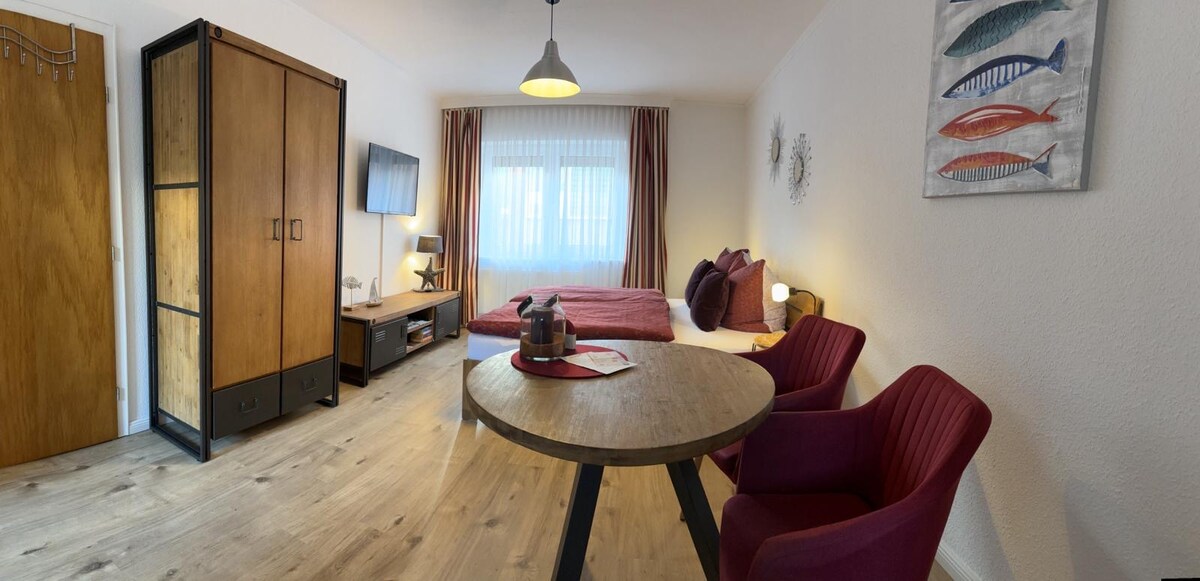 Genießen Sie Ihren Urlaub in unserer modernen 2-Zimmer-Wohnung mit charmantem Hafenblick vom Balkon. Nur 200m vom Strand entfernt, bietet die Wohnung alle Annehmlichkeiten: eine voll ausgestattete Küche, ein gemütliches Wohnzimmer und ein modernes Bad. Ihr PKW ist auf dem eigenen Stellplatz sicher untergebracht. Cafés, Restaurants und das Weltnaturerbe Wattenmeer sind in wenigen Gehminuten erreichbar.