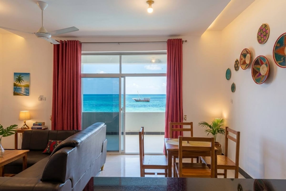 Ընդամենը մի քանի քայլ է հեռու Հնդկական օվկիանոսից: ՈՒՀՈՒՐՈՒ վերին հարկի բնակարան, 180 -220 սմ մահճակալ և թախտ հյուրասենյակում: Լիովին կահավորված խոհանոց, ճաշասենյակ/հյուրասենյակ: Տեղակայված լինելով Ջամբիանի Մֆումբվիում ՝ փիրուզագույն ամենագեղեցիկ ջուրը, որ երբևէ տեսել եք: Հեռուստացույց Netflix մուտքով, օդորակիչով, արագ Wi - Fi - ով, ամենօրյա մաքրումով, մասնավոր ավտոկայանատեղիով, տեռասով և անվտանգությամբ, չհրկիզվող պահարանով, արդուկով և տախտակներով, վարսահարդարիչով: Նման վայր չկա ամբողջ Զանզիբարում: Մասնավոր տանիք վերևի տեռաս ՝ արևի շողերով/արևի ճառագայթներով