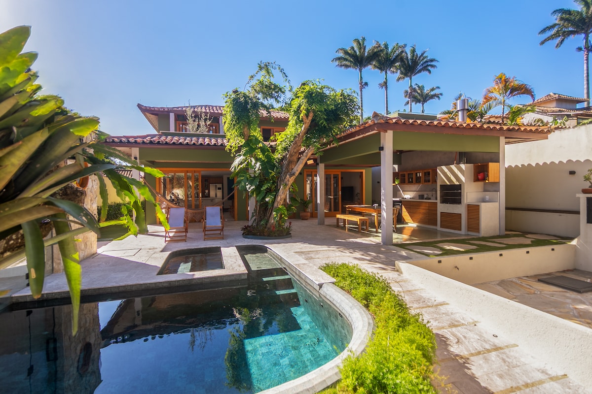 Magnificent, upper scale, spacious, elegantly decorated, 4-bedroom, 6 bathrooms, overlooking Manguinhos & Geriba Beaches, Buzios’ white-sanded and trendiest beach. Newly remodeled, air-conditioned bedrooms. Private pool, barbecue, steam sauna, & patios. Gated-community, 24h security & private access to beach. Oversized master bedroom w/ round Jacuzzi - breathtaking ocean & mountain views. The open kitchen integrates w/a spacious living-room. Maid: 4 hours p/day for common-area cleaning only.