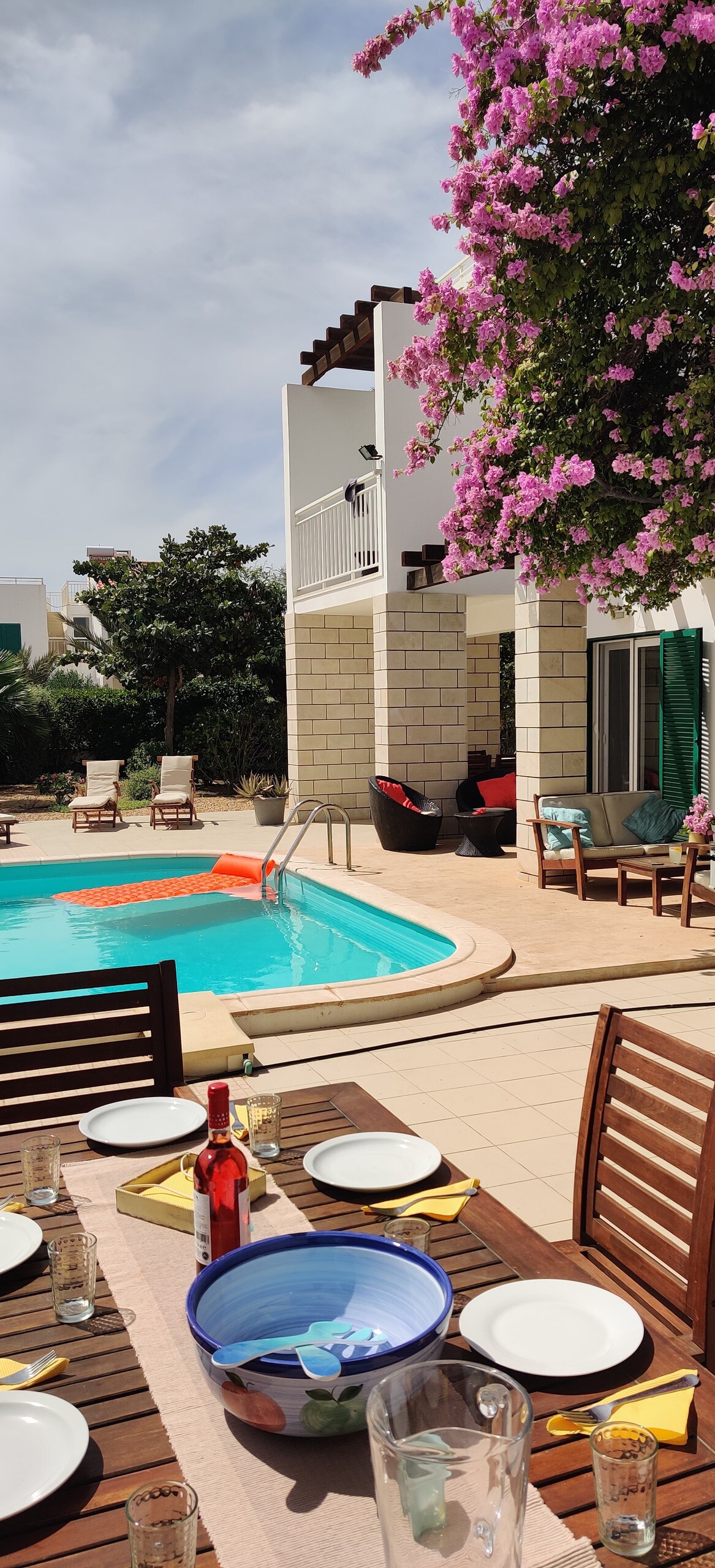 A large detached private 4 bedroom villa sleeping up to 8 close to Santa Maria. Situated at the end of a quiet Date Palm lined street and set on 830 SQM of mature enclosed gardens with extensive terraces, balconies and private pool. A large sitting room opens out on to the terraces around the pool with a range of sun beds, loungers and comfortable seating. The house is a 15 mins walk to Ponta Preta beach, 5 mins in a taxi to Santa Maria town and beach, or 7 mins in a taxi to Kite Beach.