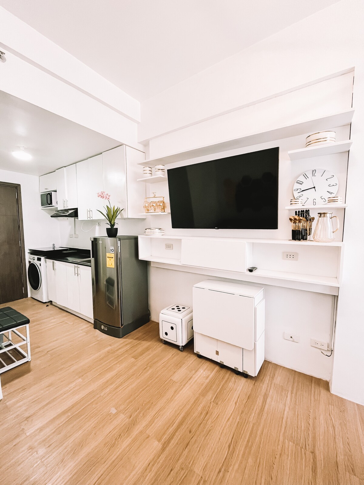 Relax in your cozy home away from home! This unit features a 65-inch smart TV with Netflix, Disney+, and Prime Video. The kitchen is fully equipped with an induction cooker, water dispenser, and rice cooker. Enjoy a refreshing shower with our strong water supply and heater. The spacious bedroom offers you a queen-sized bed and ample storage. Every detail is crafted for your comfort and a tranquil stay.