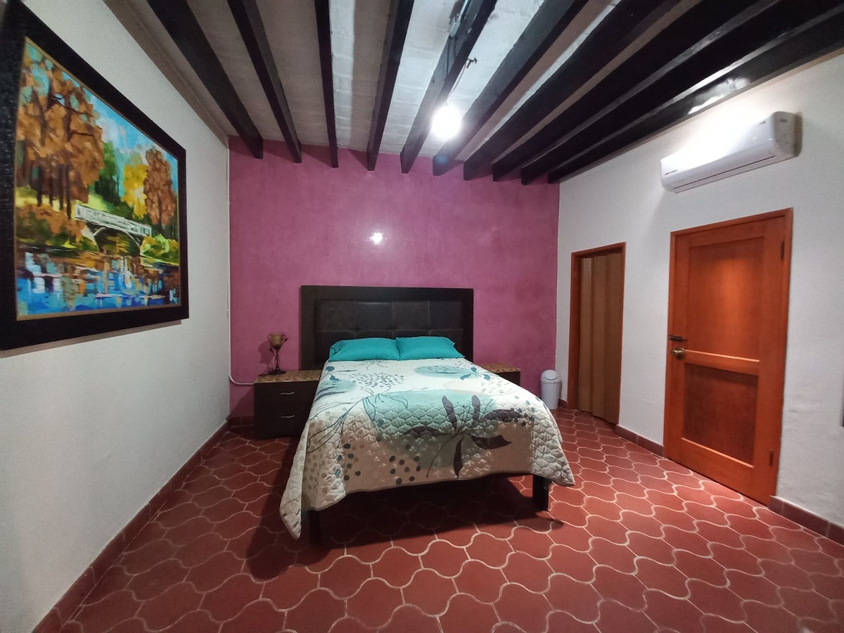 Ubicado en el centro de la ciudad a una cuadra del Hospital San Jose. Cuenta con baño privado dentro del departamento y esta equipado con cómoda cama matrimonial de memoryfoam, cocineta, internet de buena calidad, smart TV Roku ... Ideal para viajes de trabajo(facturamos). Contamos con servicio de transporte(costo extra).