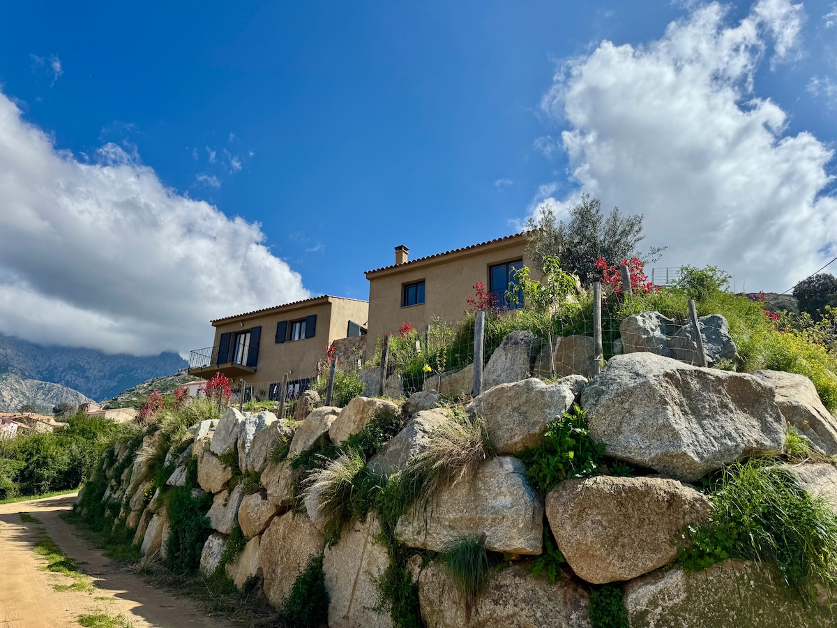 ALTIANI, très beau village typique du centre Corse au riche patrimoine, détendez-vous dans ce logement de 45m2 calme et élégant. bénéficiez d'une cuisine/salon équipée, SDD privative avec toilettes. une grande chambre voutée, spacieuse, clim - terrasse privée, vue imprenable sur les chaines de montagne - environnement naturel privilégié. Au cœur de la corse mi chemin mer/montagne, rivière, Aléria et les plages à 30 mn, Corté 20mn,randonnées magnifique vallée de la Restonica, les Lacs, GR20.